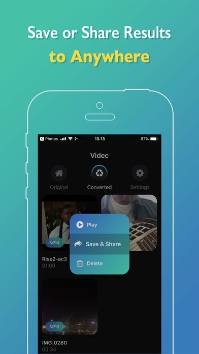 MP4に変換することで、より多くの場所でファイルを利用することができます。例えば、端末だけでなくクラウドに保存したり、他のアプリやネット上で共有することも可能になります。一度でもファイルのアップロードに失敗した経験のある方には必見のアプリです。