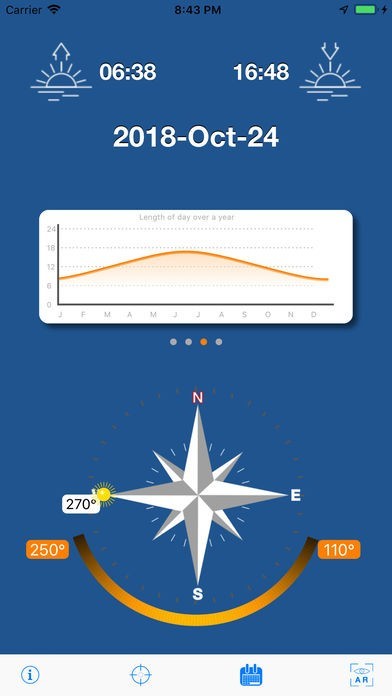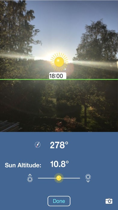 - AR mode where you can follow the sun path via your device camera. A sun icon is projected to the live view of your device and you will se how the sun altitude shifts when moving you device along the horizon.