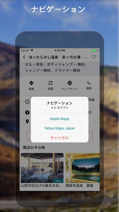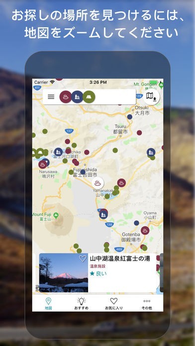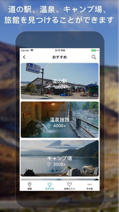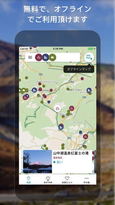 App Storeより引用このアプリがあなたの旅行にお供します!数千の温泉、道の駅、キャンプ場、旅館などを、インターネットがなくても見つけることができます。このアプリは無料で、オフラインでご利用頂けます。