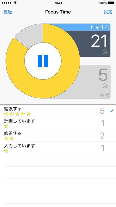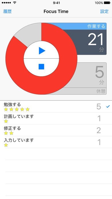 短い一定の時間集中して作業に取り組み、そのあと短い休憩をはさんでまた作業するセッションを繰り返してタスクを完了させる「ポモドーロ・テクニック」をタイマーで管理できます。