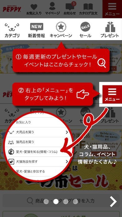 メニューから犬用品・猫用品の専用ページや情報・コラム、施設などに切り替えできるので、いつでもどこでもお楽しみいただけます。
