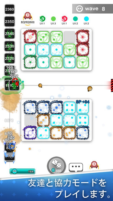 1人が一般ユニットを倒し、もう1人は成長しつつボスの動きを阻止するサイコロタワーを完成させます。