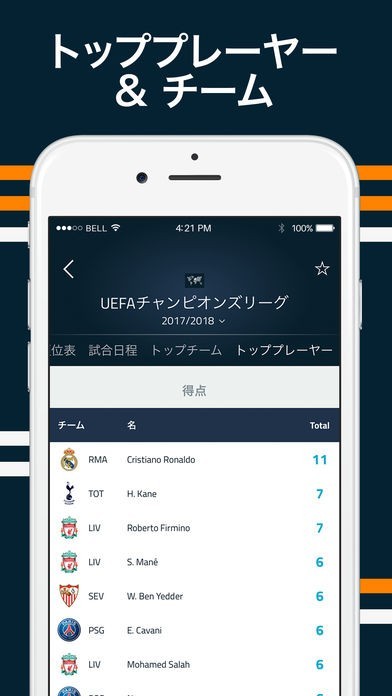サッカーの試合のスコア情報やハイライト動画を見ることができるアプリ