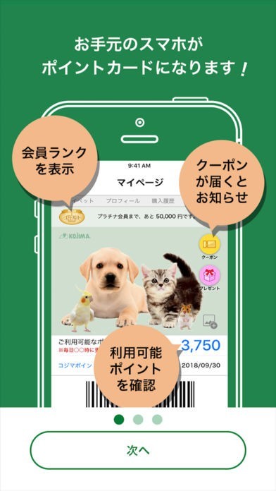 コジマポイントカードを登録すると、大切なペットの写真や情報を登録することもできます。また、貯まったポイントの確認ができたり、店舗でのお買物の履歴も見ることができるなどとっても便利な機能が満載です。