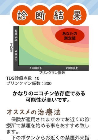 自分のタバコの依存度を計ることができるアプリが「禁煙スタータ」です。年齢・一日のたばこの本数、喫煙している期間などを入力し、そこから10問の質問に答えると依存度が分かります。質問は○×で答える仕組みになっているので、短時間で終わります。また、このアプリにはGPS機能が搭載されており、診断後は近隣の病院を検索することもできます。そのまま禁煙外来の病院に電話をかけることもできるので、なかなか禁煙が上手くいかない喫煙者の方には、自分のタバコ依存度を計るツールとして役立つこと間違いなしです。喫煙者が家族の中にいるという方にも、使えるアプリです。