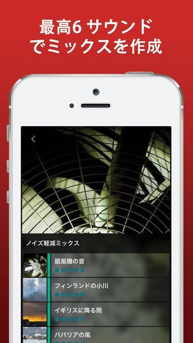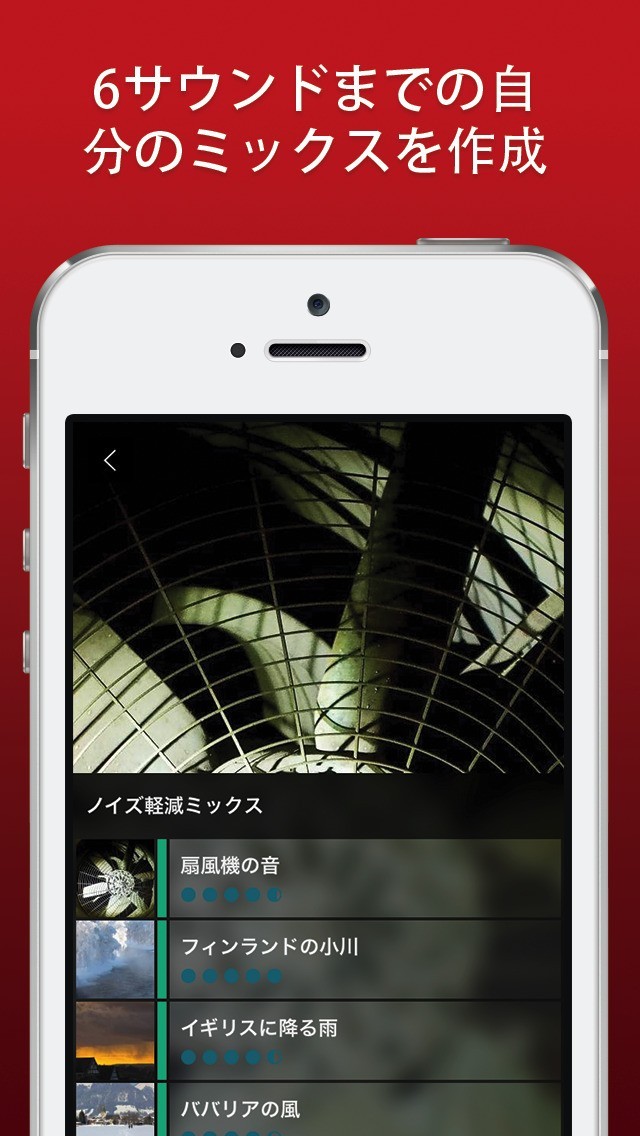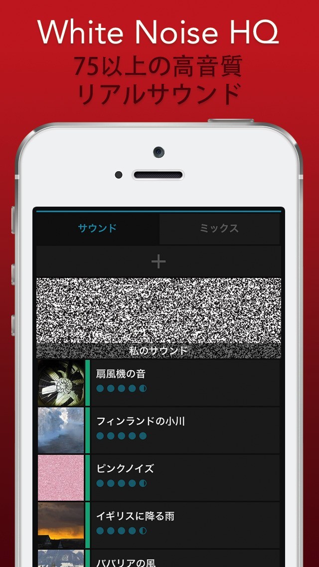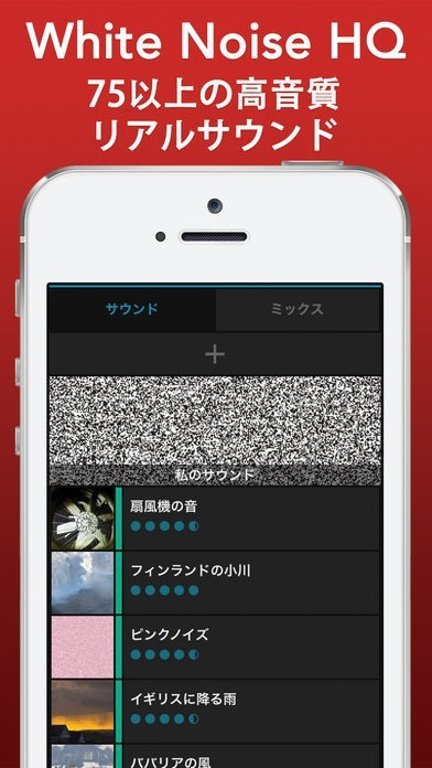 App Storeより引用世界中ライブ録音された75以上のホワイトノイズによりリラックスし、騒音をブロックし、集中力を高めてください。