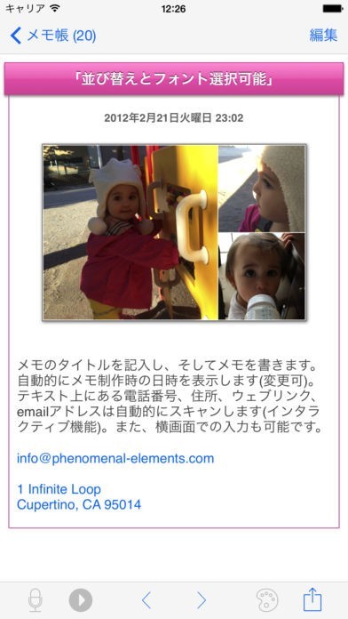入力したテキスト内のリンクで簡単にサイトへ移動や電話をかけたり、メールを送信するのも楽なので、別のデバイスや、仲間と情報を共有しやすくメモごとにキレイに管理できるため、後から確認するのも簡単です。