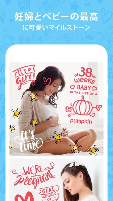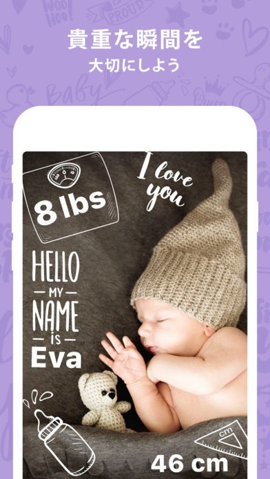 超簡単に写真を撮った時の,瞬間に感じた喜びを表現してください!小さなテキスト,かわいい落書き,フォントそしてオーバーレイで独自のタッチを加えてください。魔法のような雰囲気に写真を色づけてください。妊娠中から誕生までの旅の節目の全ての出来事のための素晴らしいフィルターのコレクションです!