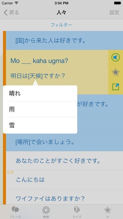 公で使われる言葉と、日常の場面で使われる言葉を切り替えることができます。どんなフレーズも高速検索で一瞬で表示可能。お気に入り登録もできるので、目的のフレーズにすぐにアクセスできます。