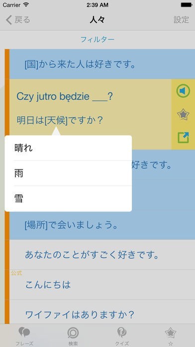 気になるフレーズなどは、お気に入り機能に登録しておくことが出来ます。予めお気に入りに入れておくことで、現地ポーランドでは、検索を省いてスムーズに取り出すことが出来ます。