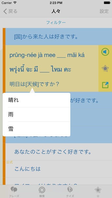 タイ旅行前の予習にも役立つ「タイ語会話表現集」では、地元の人との会話に便利なフレーズをたっぷり用意しています。 3500種類以上のタイ単語とフレーズを収録。 日本語とタイ語で文章表示を行いながら、ネイティブスピーカーによる発音機能も利用可能となっています。 発音機能は女性声と男性声で音声切り替えも行えるため、好みに合わせて選択できるのも嬉しいポイントです。 さらに便利なお気に入り機能も充実。利用頻度の高そうなフレーズはタップでお気に入りに登録しておけば、いざという時にすぐに取り出して活用できるでしょう。