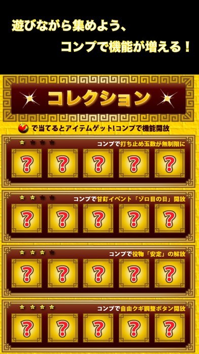 たまに出てくる赤玉で当たると、レアアイテムゲット!コレクションが完成するごとに機能を開放していきます。