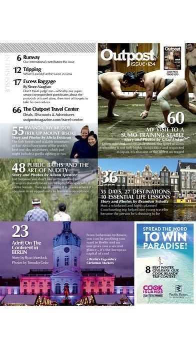 App Storeより引用Travel, adventure and culture. Outpost Magazine is Canada's best travel magazine with a unique focus on international adventure travel and world culture. Our travel magazine takes you on unforgettable journeys to explore the planet’s most hidden corners, most intriguing places and most fascinating people! Outpost Magazine offers compelling travel stories in funny and lively prose, with irreverent and insightful perspectives and a few thrillseeking rides along the way! Our focus on down-to-earth experiences, inspiring off-the-path destinations, and under-reported and unique cultures in every issue we publish helps support and protect wildlife and wilderness environments, mountain and desert regions, and indigenous people around the globe. From the Andean altitudes to the High Himalayas, from the rivers and jungles of Thailand and Brazil to the deserts of Jordan and the rainforests of Indonesia. Nobody writes it like Outpost Magazine. It’s the world in the palm of your hand!