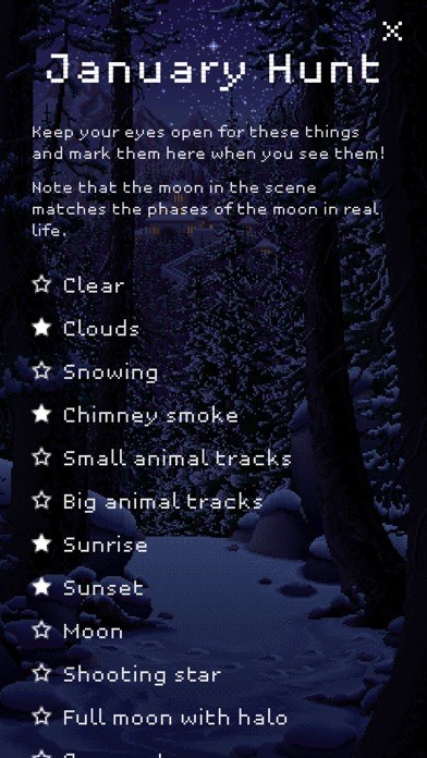 This release of the app contains the first four scenes in their full glory. The sun rises and falls in real time, storms pass through, flowers bloom, the moon and stars cross the sky. Smaller details like chimney smoke and animal footprints come and go. The image "lives" throughout the day, drawing you in, suggesting stories, and rewarding quiet observation.