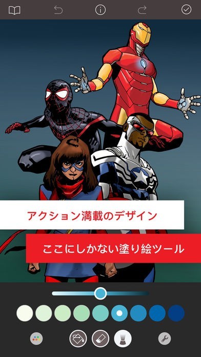 Marvelヒーローの塗り絵を楽しみ、SNS等で共有可能!