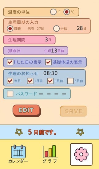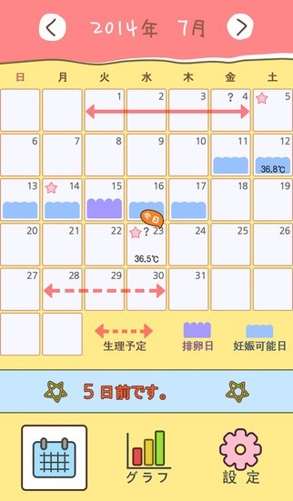 6ヶ月後までの生理予定日と排卵日(妊娠可能日)を自動計算してカレンダーに表示し、アラームで知らせてくれるので休暇、旅行、結婚、妊娠、避妊など、計画が立てやすいです。