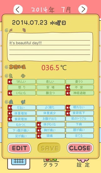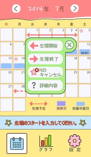 生理(予定)日、排卵日、Hした日、妊娠可能日、基礎体温、気分、症状、メモなどを Supreme生理ダイアリーで手軽で簡単に入力・確認してください。