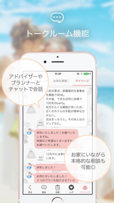 更にお家にいながらウェディングプランナーや第三者のアドバイザーと気軽にチャットで相談できる「トークルーム機能」や、簡単に理想の結婚式がみつかる「ウェディング診断」など便利なコンテンツがたくさん!