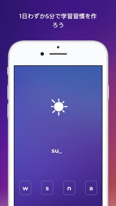 1日5分だけの英単語学習アプリです。面倒な入力は一切不要でスワイプ操作のみで行えるのでゲーム感覚で楽しみながら英単語を覚えていけます。1日5分でも続けることで着実に英単語が身に付きます。