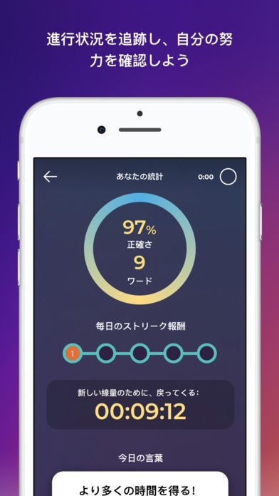 たとえば、123ワードクリア済み、73%完了済みという風に学習進捗がひとめで見れるから学習のやりがいを感じることができます。Today'sWordsコーナーでは、その日に覚えておきたい単語が表示されイラストとともにスペルが表示。印象的で覚えやすい設計となっています。