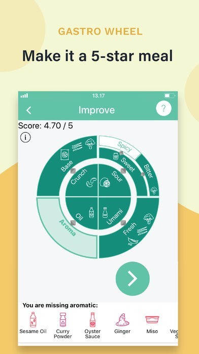 - Pimp a dish you just made: Use our balancer if your food is, for instance, too salty or too spicy. Fix it on the spot. Save your dish with in-app tips. Experiment, have fun and continue jamming. In case you discover an excellent dish, add it to your meal planner. Share it with the other users, so they know what to eat.