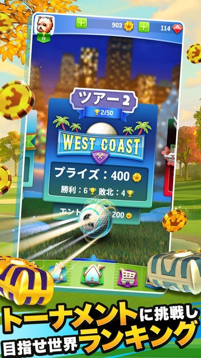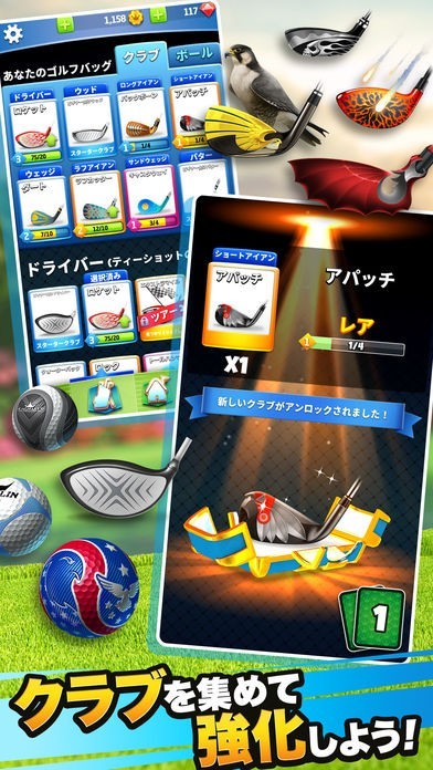 オンライン対戦以外にも、ベストスコアを登録して競い合うトーナメントモードやニアピン勝負で近く寄せるほど豪華なアイテムが手に入るゴールデンショットが用意されています。これらをクリアして手に入った宝箱から新たなクラブが手に入ることもあり、長く遊べるゴルフゲームです。