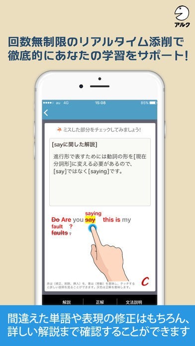 音声認識を利用して発音練習をしたり、その発音が正しいかどうかをチェックしてくれるビジュアル判定機能も搭載されているためスピーキングの強化になります。また、復習問題を解くreviewモードにはリアルタイムで自動添削をしてくれる機能も搭載されています。