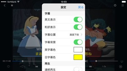 ・ 字幕表示機能: 英語と日本語字幕のON/OFFはもちろん、字幕の位置や色、字幕背景の有無を自由に変更できます。