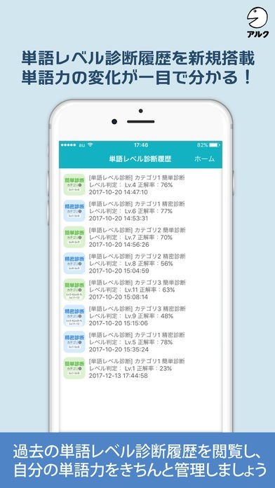 単語レベルを診断するにあたって、過去の記録を振り返ることができます。具体的にどれくらい自分が新しい英単語をマスターできたのかを知るための客観的な指標となります。