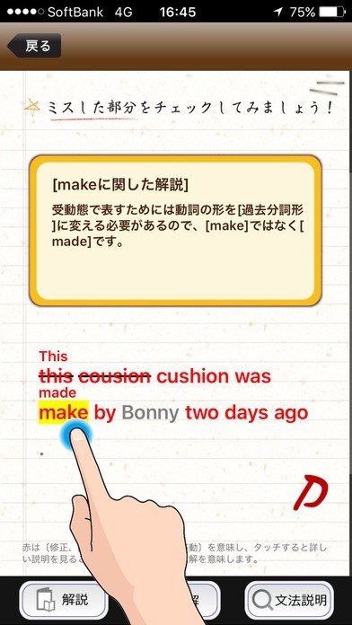 ・ 間違えたスペル、形態、文法、熟語、語順を直してくれるのはもちろん、詳細な解説と文法説明まであります。