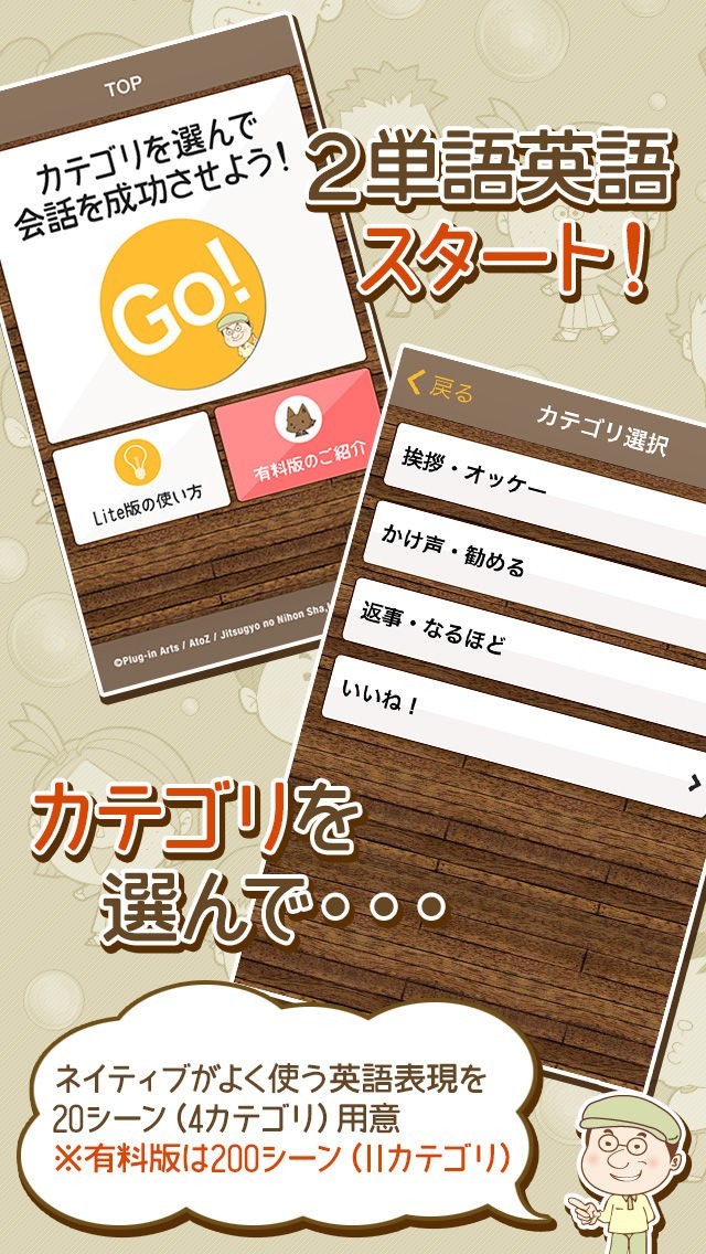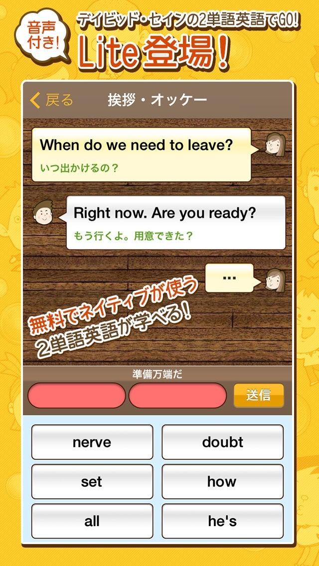 業界初チャットで学べるネイティブ英会話学習アプリ「デイビッド・セインの2単語英語でGO!」の無料版です。