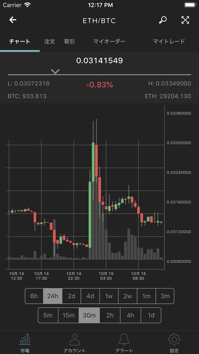 3種類のビットコインのチャートを表示することが出来るようになっていて、6時間、24時間、48時間の時間間隔で作成されたチャートを閲覧することが可能となっています。
