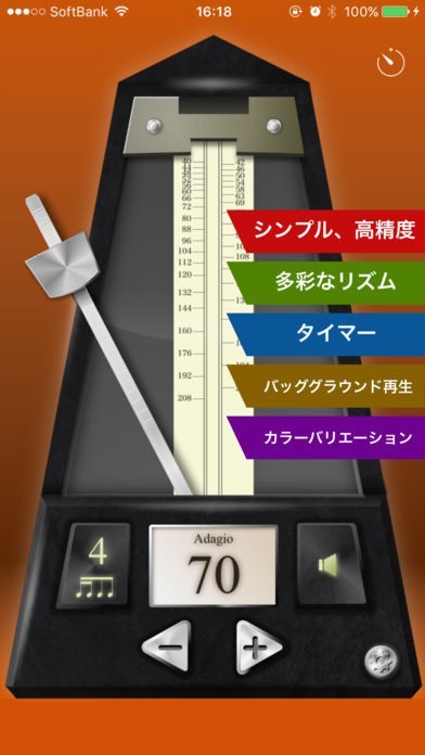iPhoneやiPadが楽器練習ツールに早変わりするメトロノームアプリです。 シンプルながら使い勝手の良いアプリとなっており、様々な楽器を練習するときに使うことができます。バックグラウンド再生機能や音を鳴らさずにテンポがわかる枠表示機能もあるので、音を出せないシーンでも安心です。 一定のテンポを刻むだけでなく7つのリズムパターンも収録されているため、リズム練習をすることも可能です。 本体や背景の色を変えて自分好みのメトロノームにすれば練習がもっと楽しくなるかもしれません!