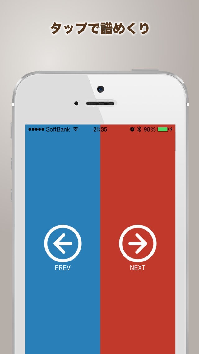 画面の左右をタップして、ページをめくっていきます。赤はNEXT、青はPREVになり、ページをめくったり戻ったりします。簡単に操作でき、色分けされているのでタップする場所がわかります。