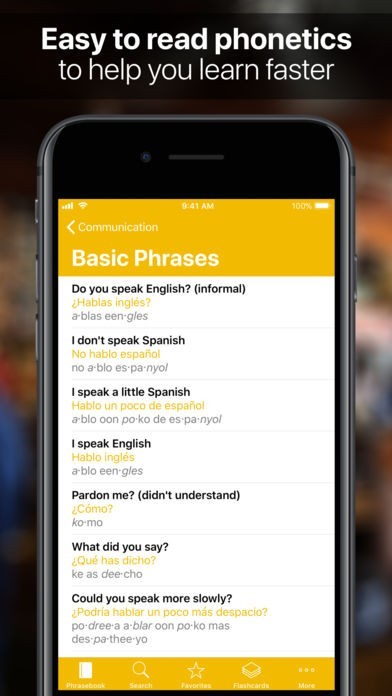 Written specifically for English-speakers, this phrasebook leaves no room for mispronunciation. Each phrase includes a translation to Spanish, an easy-to-read phonetic translation, and an audio recording of a native Spanish speaker - all contained in a well structured, user-friendly interface.