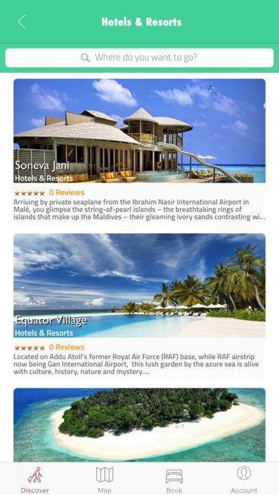 モルディブへの次の旅行のためにホテル内にアプリを予約してください。訪れたい場所をすべて覚えておいてください。