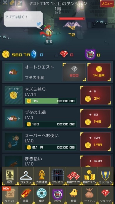 寝ている間や仕事をしているときなどはオートクエスト機能を利用することで、自動的にパワーアップをするために必要なコインを集めてくれるのでスムーズにゲームを進めることができます。