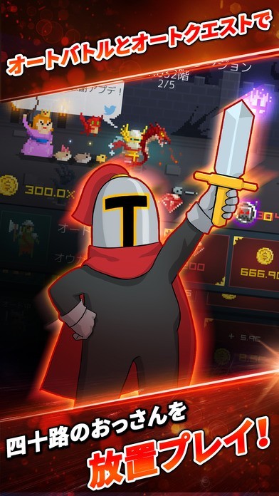 「中年騎士ヤスヒロ -おじさんが勇者に- ドット絵RPG」は絶対に死なないおじさん勇者ヤスヒロとなって、仲間の力を借りながらダンジョンを攻略していくRPGゲームアプリになります。昔懐かしいドット絵のキャラクターたちが画面上を動き回るようになっていて、オートクエスト機能で忙しい人でも無理なく進めることができます。