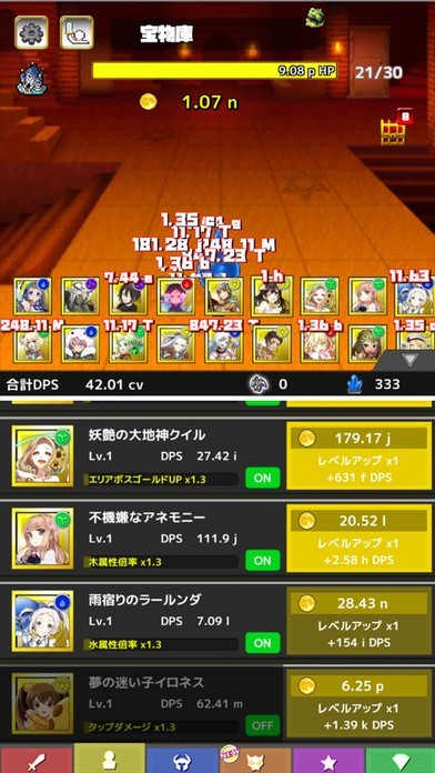 ゴールドを使ってレベルアップしたり、秘宝を使って固有強化も可能!