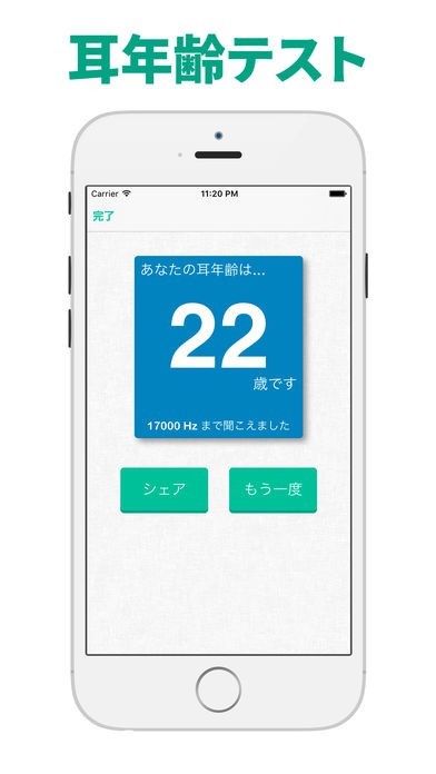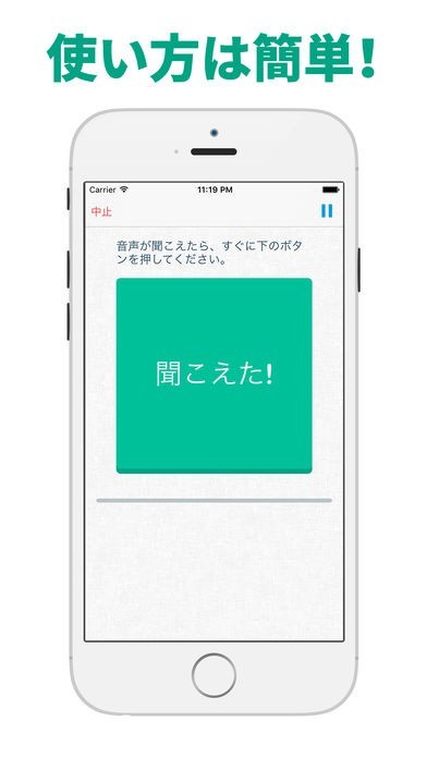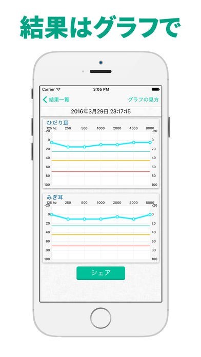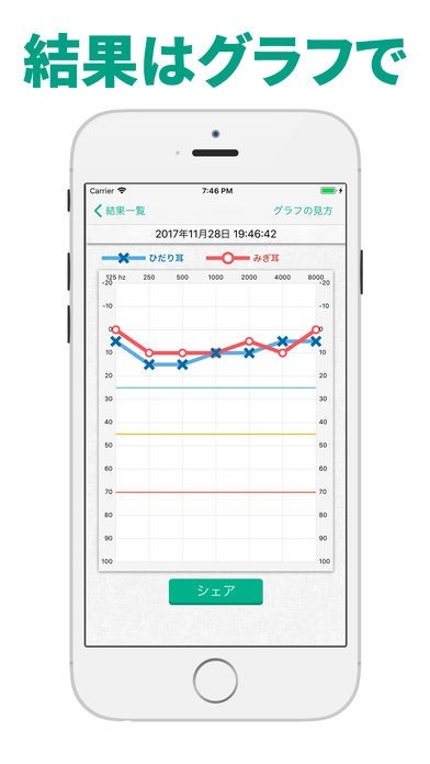 スマートフォンやタブレットで自宅でお手軽に聴力検査を行うことができるアプリです。 耳の年齢を調べるテストも用意されています。ご自宅でも病院レベルの検査をすることができます。 内容は125ヘルツから8000ヘルツまでの聴力を調べることができ、結果はわかりやすいグラフ表示となっています。 さらに結果をSNSで共有することもできます。