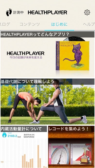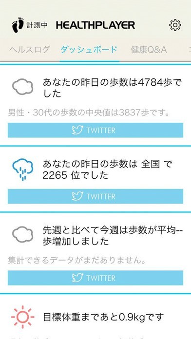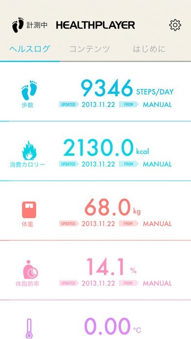 「HealthPlayer」は持ち歩くだけでユーザーの歩数や消費カロリーなどを計測してくれる歩数計アプリになります。歩数計としての機能だけでなく、血圧や睡眠時間、体重などのデータを入力することができるようになっているほか、食事の写真とともにカロリーやコメントを入力して記録することも可能となっています。
