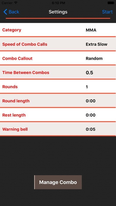 Work with the Combat Coach to adjust combos, speed, and intensity. There are over 60 audio techniques leading to endless combinations. You can adjust the time between combos, the speed at which the combos are called out, the order of the combos, and the frequency with which a particular combo is called out.