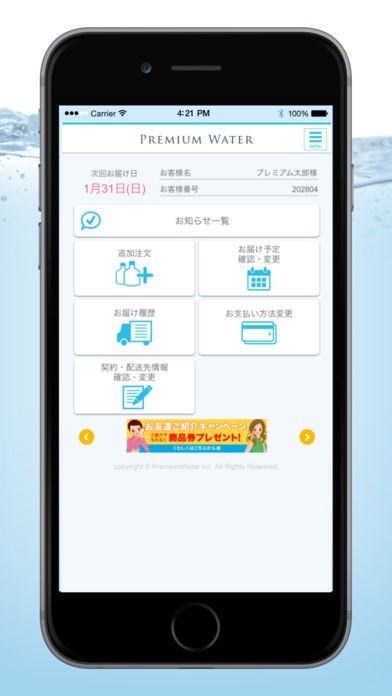 天然水の宅配サービスをスマートフォンから利用することが出来るアプリとなっていて、天然水の追加注文や契約者の変更などもアプリからスピーディーに行うことができます。