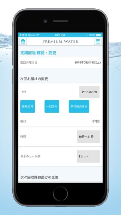 お水の配達日時をズラしたり、早めたりするのがらとても簡単。配達場所も「玄関前」などと置き配を指定できて便利。