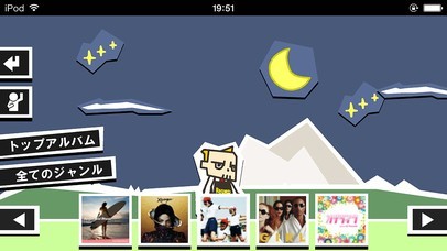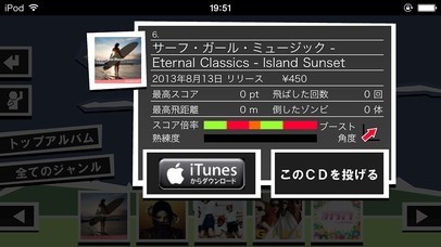 「Zombie Tunes ゾンビチューンズ」は最新のヒット曲を聴きながらゾンビを倒していくことができる爽快アクションミュージックアプリになります。iTunesストアの最新アルバムランキングから情報を取得して表示してくれるので、お気に入りの一枚を選択することでそのアルバムに収録されている曲を試聴しながらゲームを楽しむことができるようになっています。画面を左から右へフリックすることでCDを飛ばして迫ってくるゾンビを倒すことができるようになっていて、画面をタップすることでブーストモードに突入してCDのスピードをアップさせることができます。