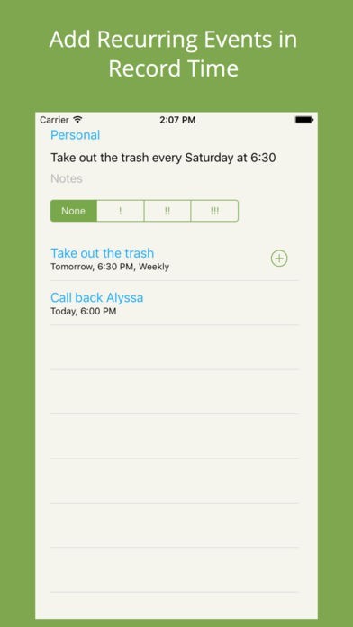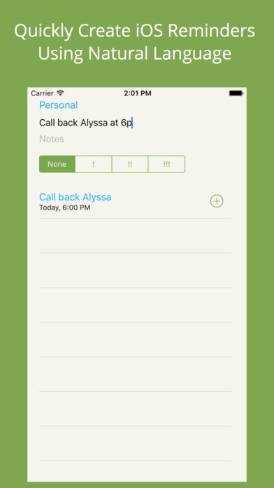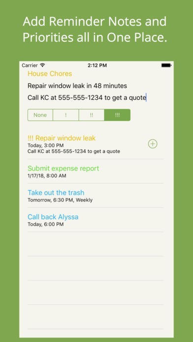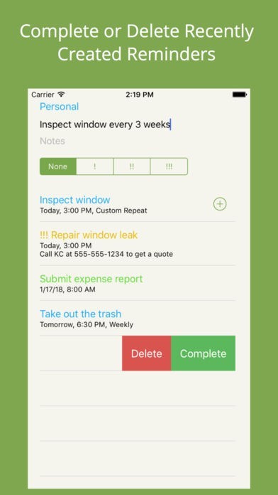 Quickly and easily add priorities and notes all in one location. Swipe left or right to create reminders in any of your reminders list. You can even complete or delete recently created reminders right from the app.