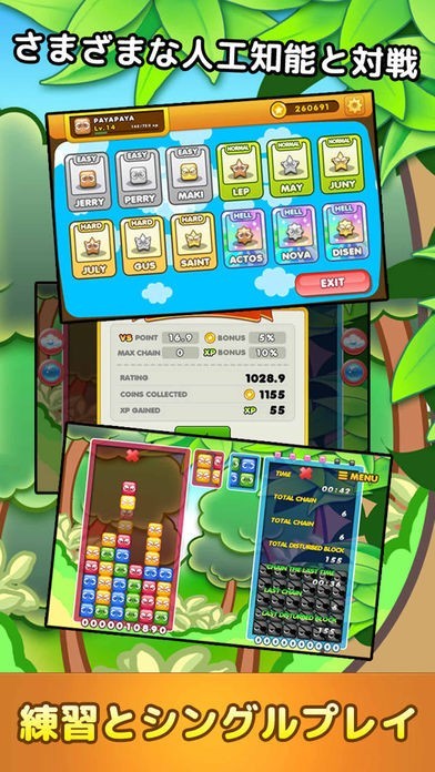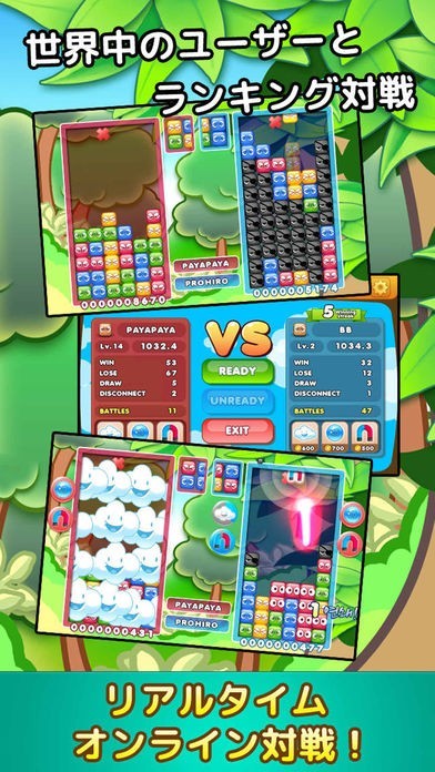 上から降りてくる2つのブロックを同じ色の4つ以上接続してスコアを得て、そのスコアに邪魔ブロックを生成して相手を攻撃して勝負を競います。