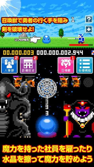 貯まった魔力で従業員を増やしたり設備投資を行ったり、そして勇者の行く手を阻む召喚獣を呼び起こすことができます。