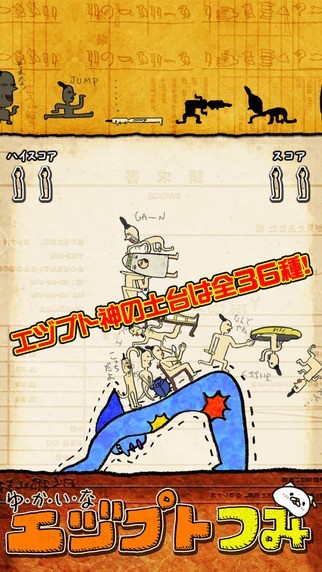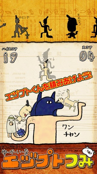 積み上がったエヅプトくんたちを見ると妙な達成感があります。土台の種類が複数あるので、色々なパターンの積み方を試すことができます。プレイすると自然と笑顔になるゲームです。