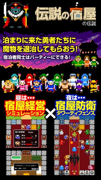 「一本道タワーディフェンス 伝説の宿屋の伝説」は、宿屋の経営シミュレーション付きで、本格的なタワーディフェンスを楽しむことができます。リアルタイムで様々なモンスターが宿屋を襲撃してくるため、勇者の力を借りて撃退しましょう。プレイヤーは宿屋の主となって、設備を整え、勇者たちが有利に戦闘を進められるように工夫します。キャラクターは懐かしいドットで表現されています。攻略のポイントは、勇者たちに居心地の良い環境を昼間のうちに整えるということです。ベッドやお風呂などにお金をかけてグレードアップしておくと、より強力な勇者が宿屋を訪れるようになります。
